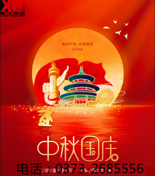 國(guó)慶中秋雙節(jié)即將來臨,新鄉(xiāng)市新久振動(dòng)機(jī)械有限公司全體員工祝福您,愿你:一笑煩惱跑,二笑憂愁消,三笑心情好,四笑不變老,五笑興致高,六笑幸福繞,七笑快樂到,八笑收入好,九笑步步高,十全十美樂逍遙。