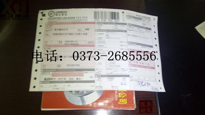 貴公司訂購XJF-4型倉壁振動器配件:端蓋、甩塊和螺絲,已通過順豐速遞發往龍口市。運費、保價費、送貨費及其它費用已付清。預計三日左右達,請保持手機暢通,注意查收。使用前請詳細閱讀倉壁振動器及振動電機使用維護說明書。